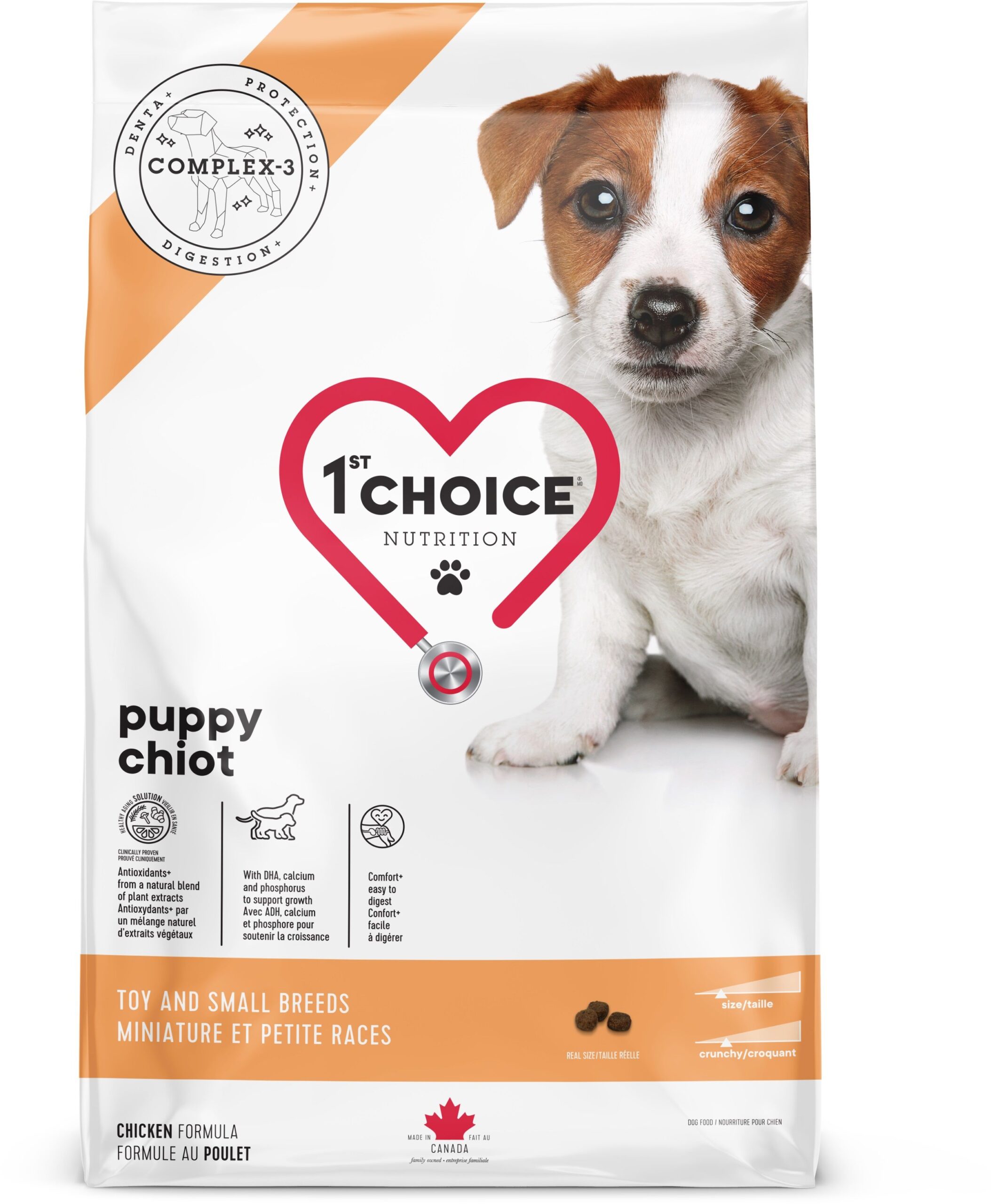 Cette savoureuse formule est conçue pour répondre aux besoins nutritionnels particuliers de nos plus petits dégustateurs : les CHIOTS miniatures et de petites races. La protéine de poulet a été choisie pour sa digestibilité et les fibres prébiotiques aident à maintenir un transit intestinal actif. Cette nourriture soutient aussi la croissance des os, le développement du cerveau et des organes grâce à l’ajout d’ADH, de calcium et de phosphore. Elle contient un mélange unique d’antioxydants qui constitue une stratégie préventive visant à protéger les cellules de l’oxydation dès le plus jeune âge. C’est la première étape vers une longue et belle vie en santé.