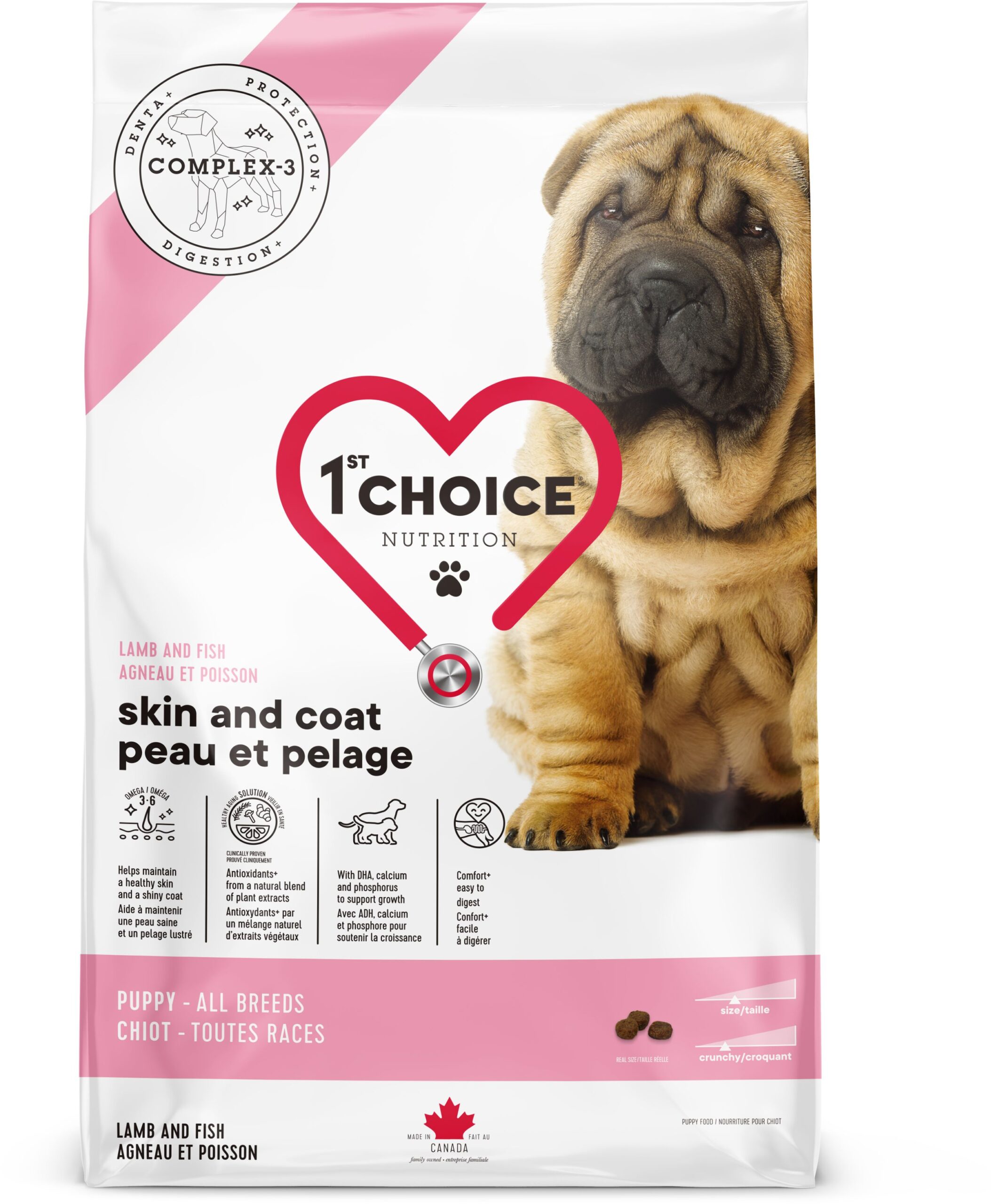 La formule PEAU ET PELAGE agneau et poisson a été conçue pour répondre aux besoins nutritionnels des chiots de toutes races. L’ajout d’oméga-3 et d’oméga-6 leur assure une peau saine et un pelage soyeux. Les petites croquettes débordent de saveur pour que la découverte de la nourriture sèche soit agréable et réussie. Cette formule complète et équilibrée soutient la croissance des os, le développement des fonctions vitales et le développement du cerveau, en plus d’aider les chiots à se bâtir un bon système immunitaire. Facile à digérer, elle constitue une option sans poulet très appréciée. La première étape pour grandir en santé et en beauté.