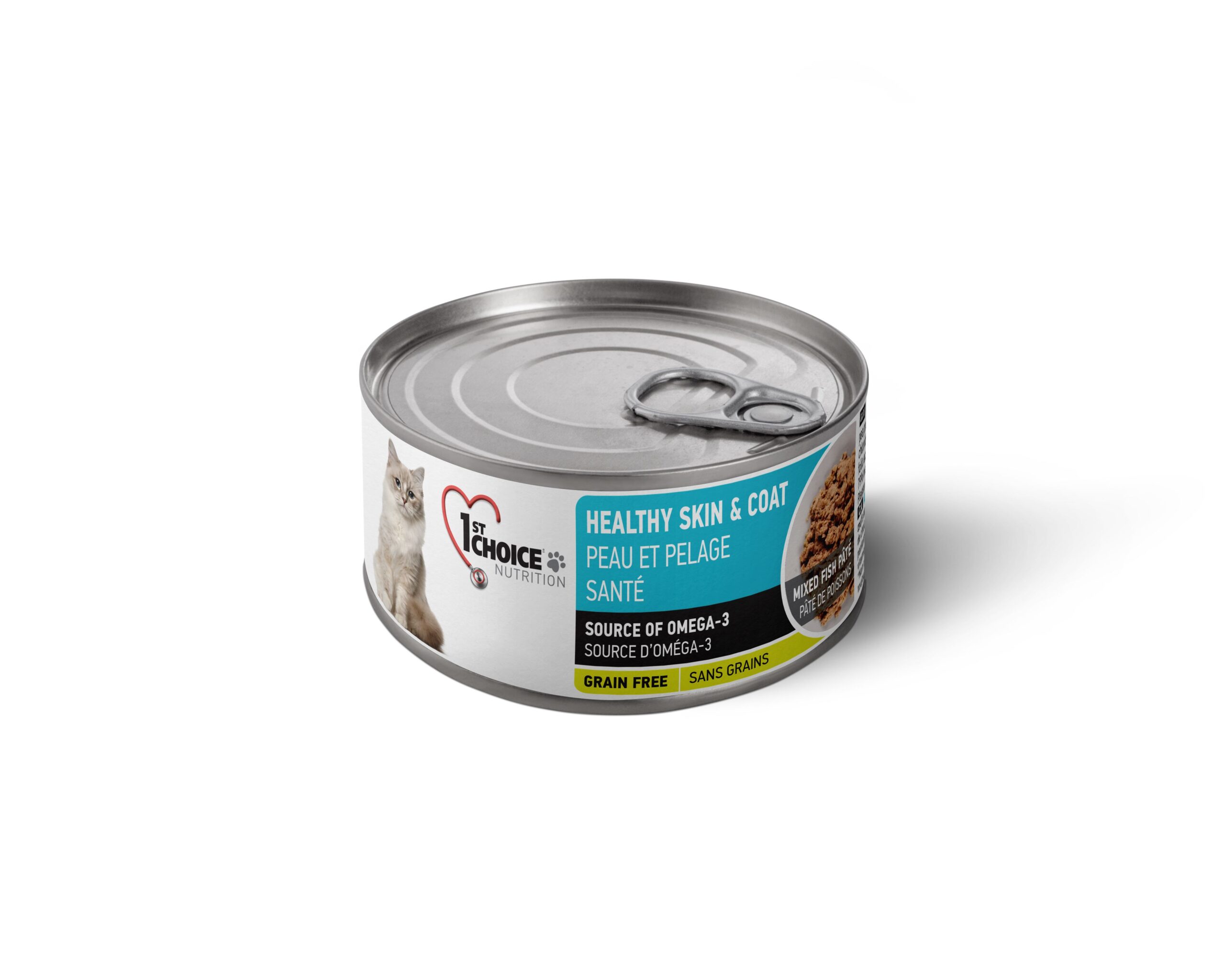 Essayez notre formule humide 1st Choice – Peau et pelage santé! Offrir une nutrition mixte « humide et sèche » est la meilleure façon de nourrir votre chat. Ce type d’alimentation lui procure les nutriments complets de la nourriture sèche, tout en lui apportant l’hydratation, la saveur et les oméga-3 de la nourriture humide. Votre chat appréciera le goût exceptionnellement savoureux de ce pâté de poissons de la formule Peau et pelage santé.