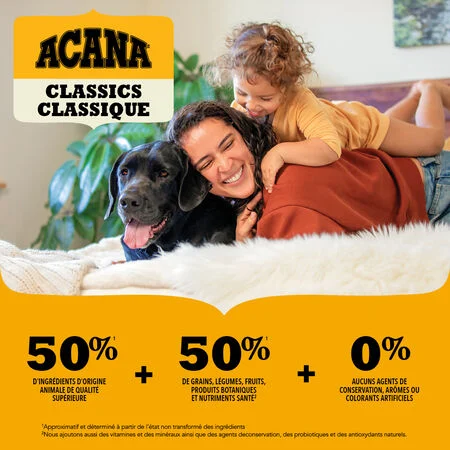 - Composée de 50%1 d’ingrédients d’origine animale de qualité supérieure, équilibrés avec 50% de grains entiers, de légumes, de fruits et de nutriments2