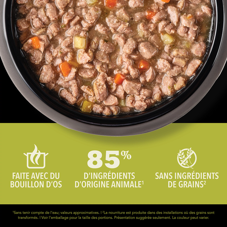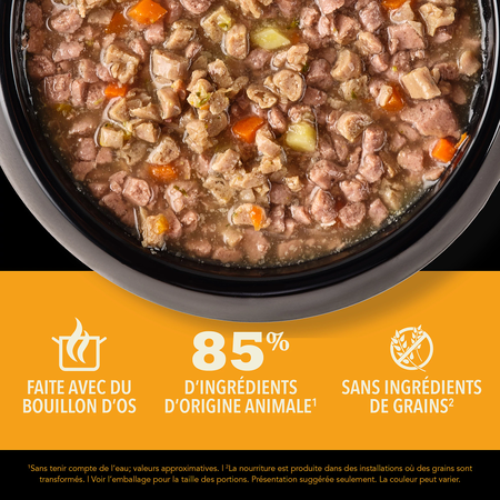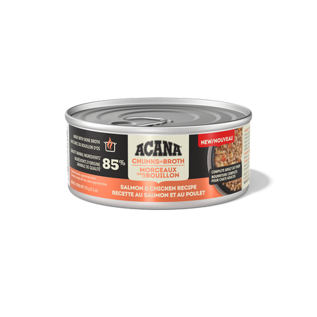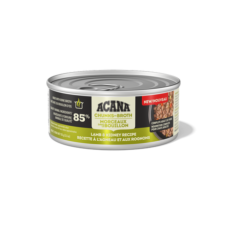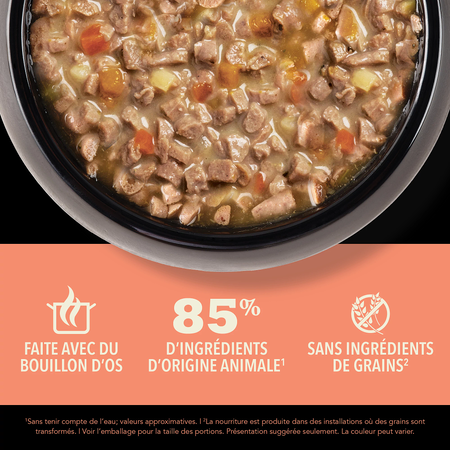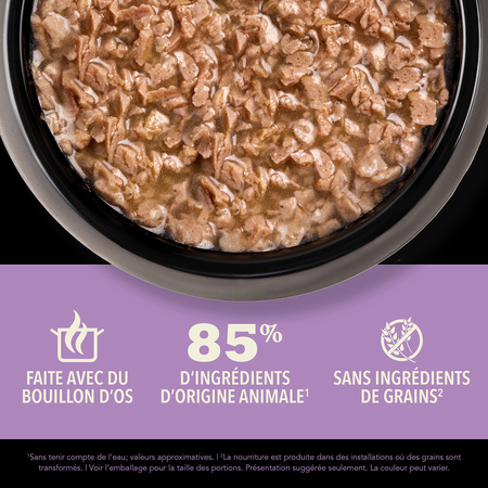 Nourrissez votre chat avec les ingrédients d’origine animale riches en protéines et le délicieux bouillon d’os de la nourriture humide pour chats ACANAMC Morceaux dans le bouillon! Faite à 85 % d’ingrédients d’origine animale1, nos recettes fournissent à votre chat les protéines animales nourrissantes dont il a besoin. Chaque conserve contient des ingrédients d’origine animale nourrissants, comme du poulet et du thon savoureux servis sous la forme de morceaux copieux. Elle contient également du bouillon de poulet, de poisson et de dinde hydratant pour titiller les papilles de votre chat et lui apporter l’hydratation dont il a besoin. Cette recette contribue également à la santé immunitaire de votre chat ainsi qu’à la santé de sa peau et de son pelage. Servez à votre chat une nourriture humide qui l’aidera à se sentir si bien à l’intérieur que cela se verra à l’extérieur!