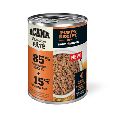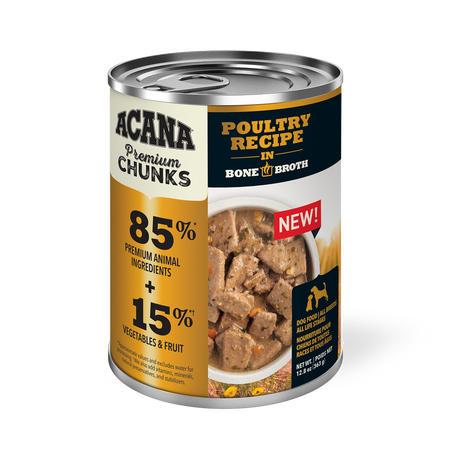 Ne vous arrêtez pas au premier ingrédient avec les recettes ACANAMD comme les Morceaux de qualité supérieure ACANA, confectionnés avec soin du début à la fin. Notre Recette au poulet avec bouillon d’os contient 85%* d’ingrédients d’origine animale, dont des morceaux de volaille de qualité supérieure, équilibrés avec 15%*† de fruits et légumes visibles dans du bouillon d’os savoureux. Ajoutez-la sur les croquettes ACANA préférées de votre chien en guise de garniture humide avec un éclat de saveur, ou offrez-lui ce petit plaisir seul en guise de repas.