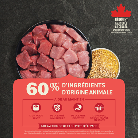 Faites dans l’excès avec les ingrédients riches en protéines animales et les grains entiers riches en fibres contenus dans la nourriture ACANAMD Grains santé! Notre mélange à la viande rouge ACANAMD Grains santé est spécialement conçu avec du bœuf et du porc d’élevage savoureux frais ou crus. Notre mélange équilibré est également composé de grains sains comme de l’avoine, du sorgho et du millet. Ces grains riches en fibres et sans gluten procurent des nutriments qui aident au maintien de la santé digestive. Notre mélange à la viande rouge est fait à 60 % d’ingrédients d’origine animale1 et à 40 % de grains entiers, de légumes, de fruits, de produits botaniques et de nutriments2, et procure quatre bienfaits clés pour la santé. Cette nourriture riche en protéines, nutritive et délicieuse permet à votre chien de vivre une vie heureuse et bien remplie.
