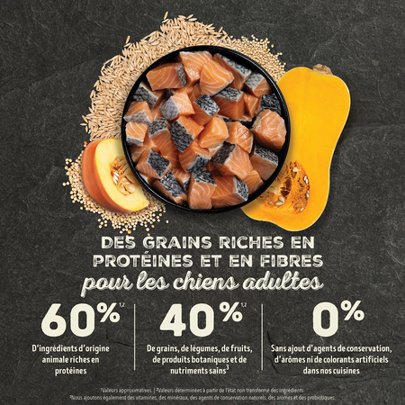 Faites dans l’excès avec les ingrédients d’origine animale riches en protéines et les grains riches en fibres de la nourriture ACANAMC Grains santé! Notre nourriture ACANAMC Grains santé Recette Mer et rivière est riche en protéines de poissons et spécialement conçue avec un mélange de saumon, de hareng et de truite crus. Elle est également équilibrée avec des grains santé, soit de l’avoine, du sorgho et du millet. Ces grains riches en fibres et sans gluten procurent des nutriments qui favorisent le maintien de la santé digestive. Notre recette Mer et rivière est faite à 60 % d’ingrédients de poissons* riches en protéines équilibrés avec 40 % de grains, de légumes, de fruits, de produits botaniques et de nutriments sains** et procure quatre bienfaits clés pour la santé. Vous obtenez ainsi une nourriture riche en protéines, nutritive et délicieuse pour aider votre chien à vivre heureux et en santé.