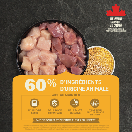 Faites dans l’excès avec les ingrédients riches en protéines animales et les grains entiers riches en fibres contenus dans la nourriture ACANAMD Grains santé! Notre mélange à base de volaille élevée en liberté1 ACANAMD Grains santé est spécialement conçu avec du poulet et de la dinde élevés en liberté frais ou crus. Notre mélange équilibré est également composé de grains sains comme de l’avoine, du sorgho et du millet. Ces grains riches en fibres et sans gluten procurent des nutriments qui aident au maintien de la santé digestive. Notre mélange à base de volaille élevée en liberté1 est faite à 60 % d’ingrédients d’origine animale2 et à 40 % de grains entiers, de légumes, de fruits, de produits botaniques et de nutriments3, et procure quatre bienfaits clés pour la santé. Cette nourriture riche en protéines, nutritive et délicieuse permet à votre chien de vivre une vie heureuse et bien remplie.