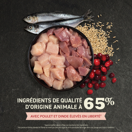 - Copieusement préparée avec 65 % d’ingrédients d’origine animale de qualité1, dont du poulet et de la dinde élevés en liberté2, ainsi que du hareng entier.