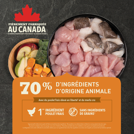 Lorsqu’il s’agit de la nourriture pour chiens ACANAMC, nous faisons dans l’excès avec tous les ingrédients qui composent nos recettes de qualité supérieure préparées ici même au Canada. Voilà pourquoi notre recette Chiot grande race est soigneusement conçue avec des ingrédients qui favorisent la croissance et le développement de votre chiot de grande race. Faite à 70 %2 d’ingrédients d’origine animale de qualité comme du poulet élevé en liberté1 frais et du merlu cru, le tout équilibré avec 30 % de fruits et légumes3 comme de la citrouille entière fraîche, des légumes à feuilles, des pommes et des poires, cette recette fournit les nutriments et les protéines animales dont votre chien de grande race a besoin pour vivre pleinement. Ces ingrédients sains proviennent de fournisseurs que nous connaissons et en qui nous avons confiance, et nos vétérinaires et nos experts en nutrition animale préparent chaque recette avec soin, afin que votre animal de compagnie se sente si bien à l’intérieur que cela se verra à l’extérieur.