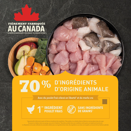 Lorsqu’il s’agit de la nourriture pour chiens ACANAMC, nous faisons dans l’excès avec tous les ingrédients qui composent nos recettes de qualité supérieure préparées ici même au Canada. Voilà pourquoi notre recette pour chiots est soigneusement conçue avec des ingrédients qui favorisent la croissance et le développement de votre chiot de race moyenne. Faite à 70 %1 d’ingrédients d’origine animale de qualité comme du poulet frais élevé en liberté2 et du merlu cru, le tout équilibré avec 30 % de fruits et légumes3 comme de la citrouille, des pommes, des poires et des légumes à feuilles entiers frais, cette recette fournit les nutriments et les protéines animales dont votre chiot a besoin pour vivre pleinement. Ces ingrédients sains proviennent de fournisseurs que nous connaissons et en qui nous avons confiance, et nos vétérinaires et nos experts en nutrition animale préparent chaque recette avec soin, afin que votre animal de compagnie se sente si bien à l’intérieur que cela se verra à l’extérieur.