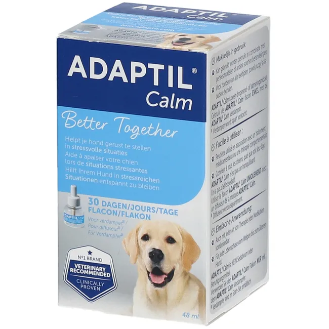 Utilisez la recharge ADAPTIL Calm tous les mois pour offrir à votre chien un apaisement et un confort continus à la maison, dans des situations difficiles, comme la solitude, en présence de bruits forts ou de visiteurs et pour affronter ses peurs.