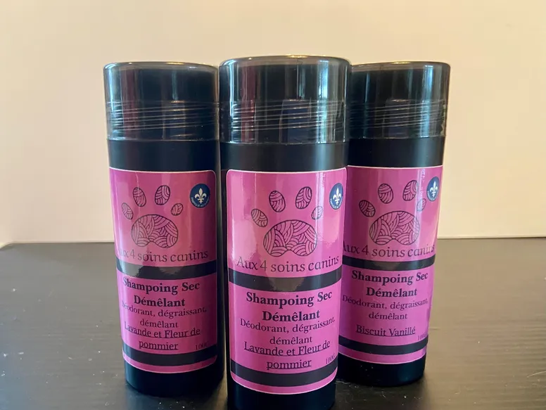 Ce shampoing sec est fait à la main et d’ingrédients naturels. Il redonne de la légèreté, du volume et une bonne odeur aux poils de votre chien. Il absorbe le surplus de sébum, déodorise et permet un démêlage à sec plus facilement. Il est offert en deux odeurs, soit biscuit vanillé ou lavande et fleur de pommier