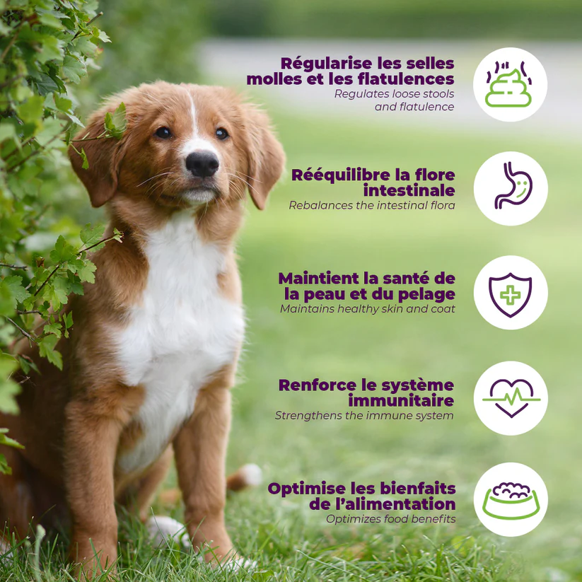 - Formule efficace et synergique pour régulariser les flatulences, réduire les selles nauséabondes, aide à reconstruire la flore intestinale durant des périodes de stress, rééquilibre la flore intestinale, renforce le système immunitaire, conserve la santé et le lustre du pelage. De plus, il augmente les enzymes naturelles et optimise les bienfaits de l’alimentation.