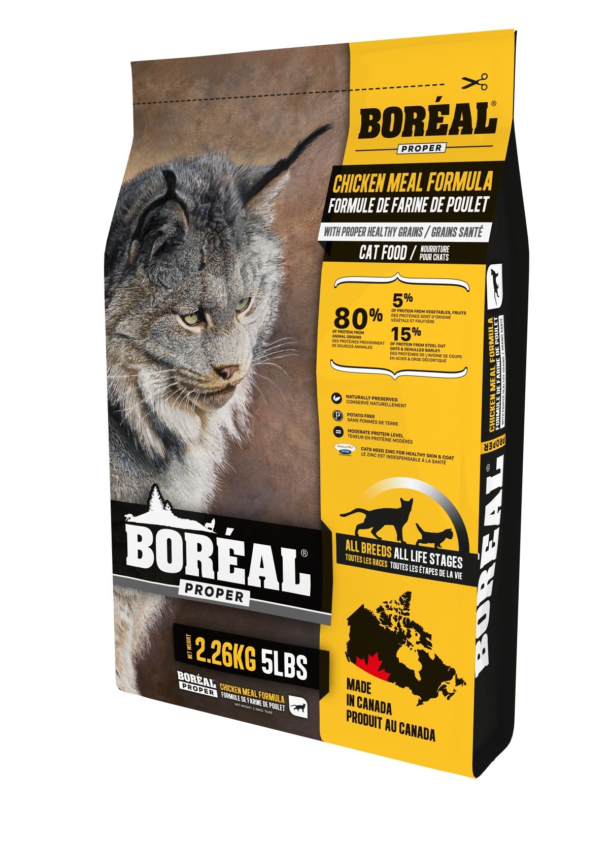 - La nourriture Boréal Proper au poulet pour chat est une nourriture sans céréales, utilisant le poulet comme une nouvelle source de protéine unique.
