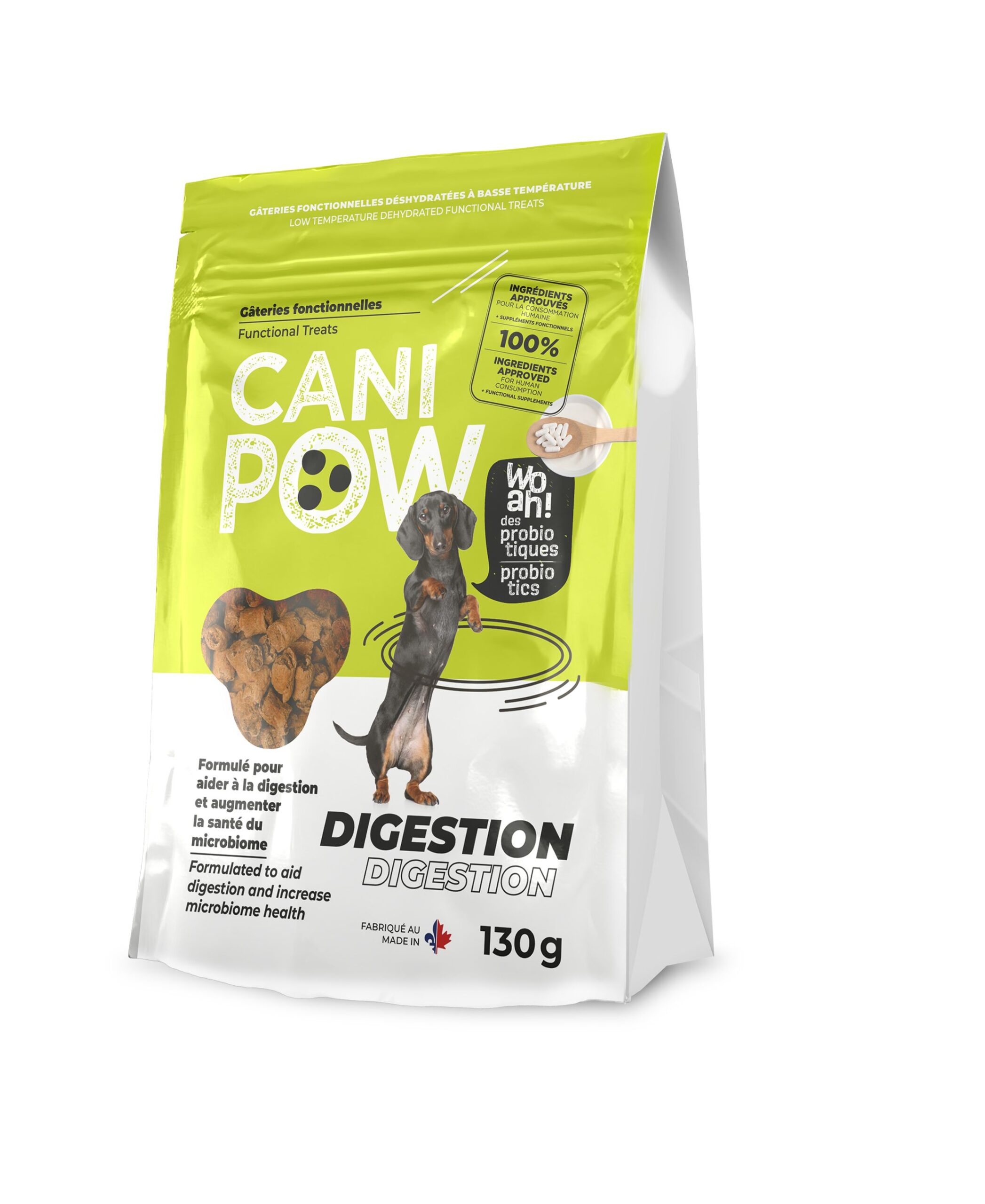 - Les gâteries CaniPow Digestion ne contiennent rien de moins que des probiotiques et d’autres ingrédients sains comme : le gingembre, les pois verts et le poisson blanc océanique.