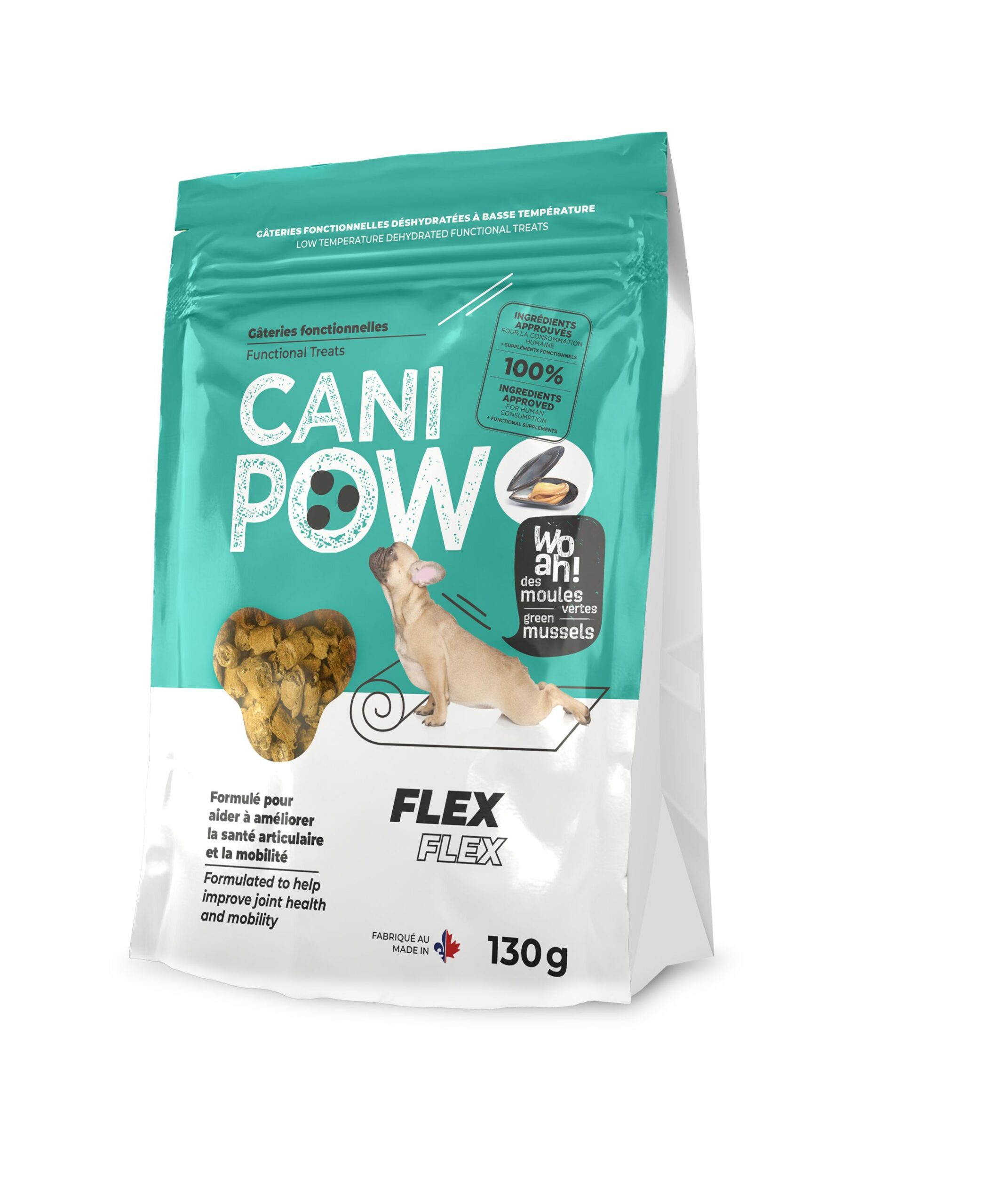 - Votre chien ne fera qu’une bouchée de CaniPow Flex, un gâterie saine à base d’ingrédients déshydratés à basse température comme : le porc, le curcuma, les graines de lin, la moule verte et un mélange d’extraits de plantes soigneusement formulé pour aider à améliorer sa santé articulaire et sa mobilité.