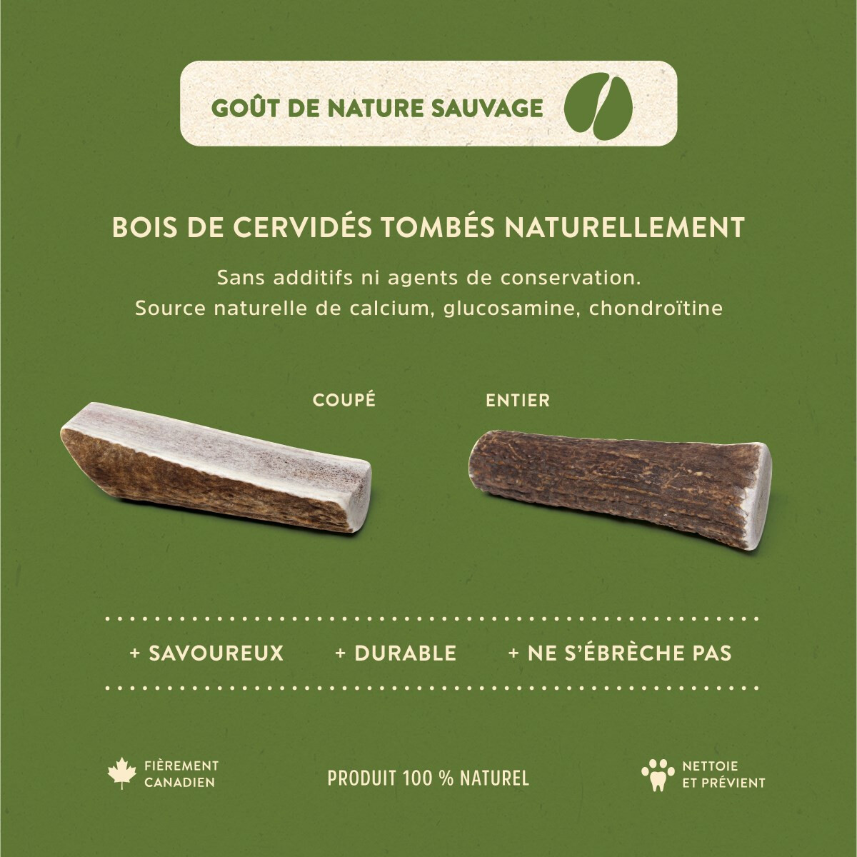 • Les bois de cervidés Dentler réveillent l’instinct naturel de votre chien, tout en lui procurant une bouche plus saine, des gencives jusqu’aux crocs.