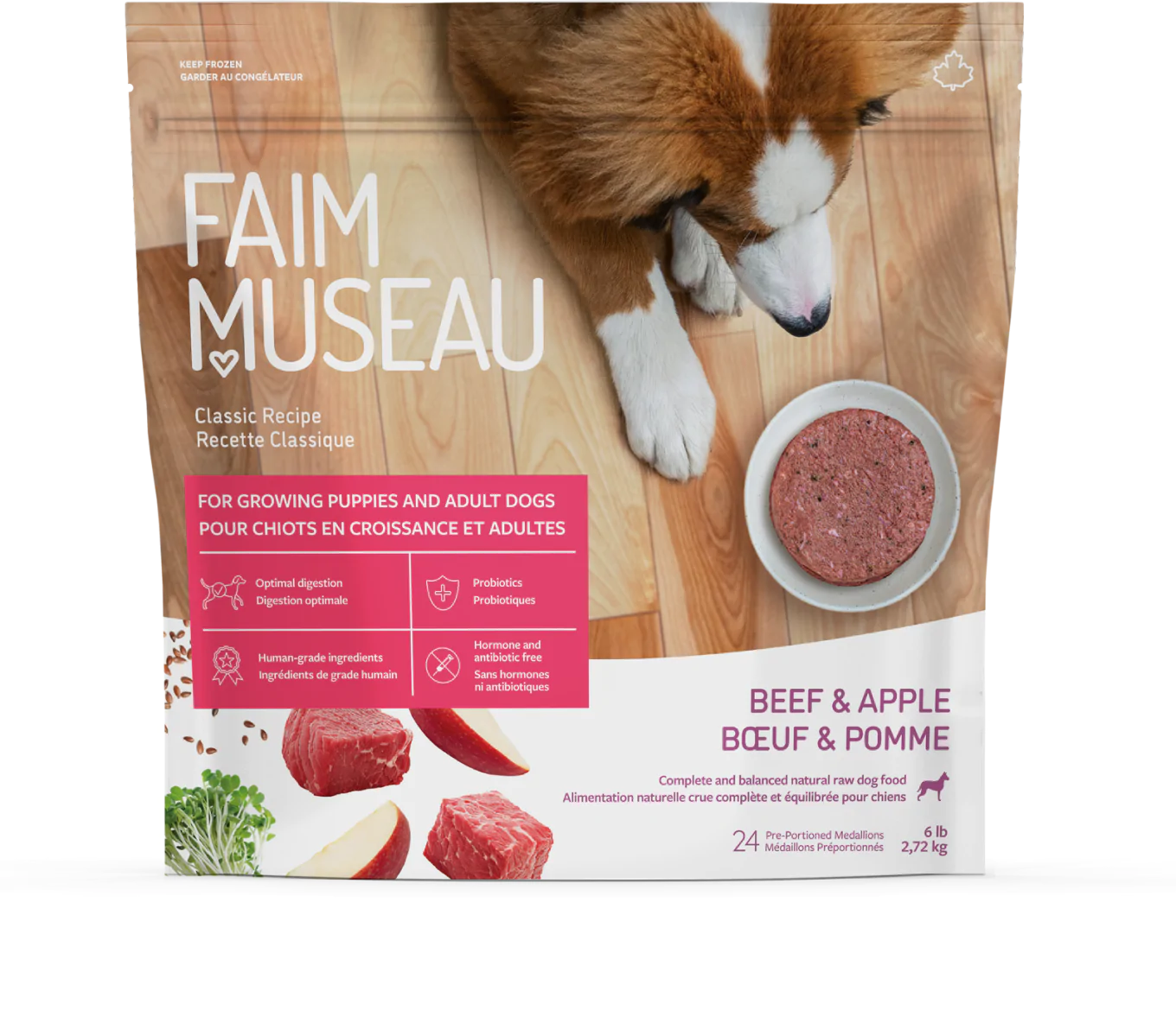 Chaque famille a ses classiques culinaires. Chez Faim Museau, il s’agit de notre formule Boeuf & Pomme. Une recette qui met en vedette du boeuf 100 % canadien et des pommes, un fruit reconnu pour aider la santé digestive. Plus calorique, cette formule est tout indiquée pour les chiens actifs et les chiots en croissance.