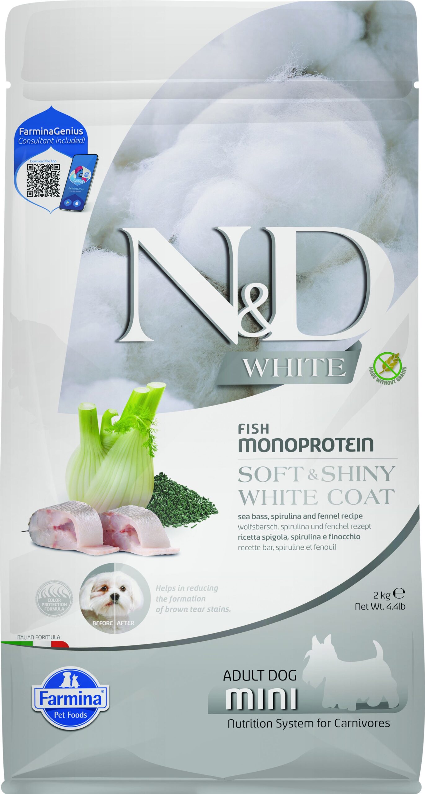 - La gamme N&D White est spécialement formulée pour réduire la formation de taches brunes sur les pelages blancs.