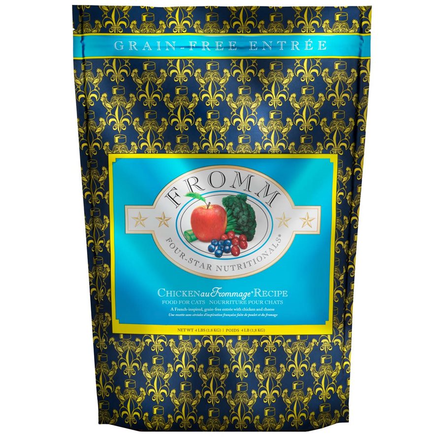 La nourriture Fromm Four-Star NutritionalsMD Recette de Chicken Au FrommageMD pour chats est une savoureuse recette sans céréales faite de poulet et du fromage. Cette recette est spécialement préparée pour assurer la cohérence, la qualité et le goût supérieur à chaque bouchée. La nourriture Recette de Chicken Au FrommageMD fournit une nutrition complète et équilibrée pour les chats de tous âges et peut être offerte en rotation avec les autres recettes Fromm Four-Star.