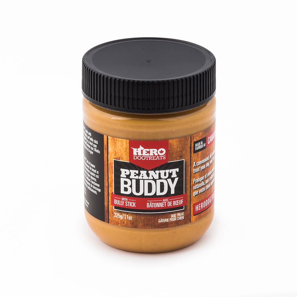 Hero Peanut Buddy™ est fait de beurre d’arachide entièrement naturel et de bâtonnets de boeuf, d’huile de chanvre ou d’arôme de citrouille. Cette friandise savoureuse est fabriquée au Canada et ne contient PAS d’agents de conservation ni de xylitol. Peanut Buddy est idéal comme friandise ou pour administrer des médicaments. Bien mélanger avant utilisation.
