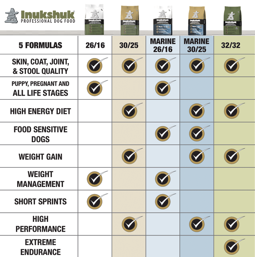 Les formules 30/25 et Marine 30/25 sont idéales pour les chiens en sous-poids. La formule 32/32 est destinée aux chiens difficiles à maintenir en poids et peu gourmands.