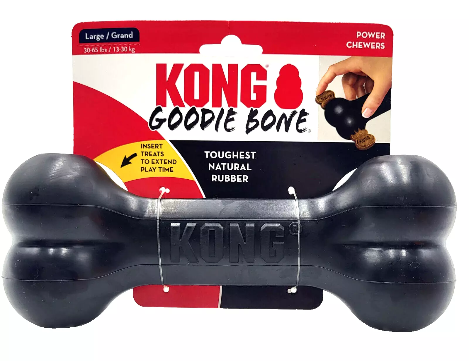 Le jouet KONG Extreme Goodie Bone™ ravit les chiens qui sont les plus durs à mâcher et qui adorent les séances de mastication. Fabriqué à partir de la formule unique en caoutchouc noir naturel KONG Extreme la plus durable, cet os est conçu pour les mâcheurs déterminés. Le KONG Extreme Goodie Bone™ est également doté de Goodie Grippers™ brevetés qui transforment ce jouet divertissant en un défi amusant de distribution de friandises qui peut être rempli avec les croquettes préférées de votre chien. Vous voulez prolonger la séance de mastication ? Remplissez-le de KONG Snacks™ et attirez-le avec un peu de KONG Easy Treat™.