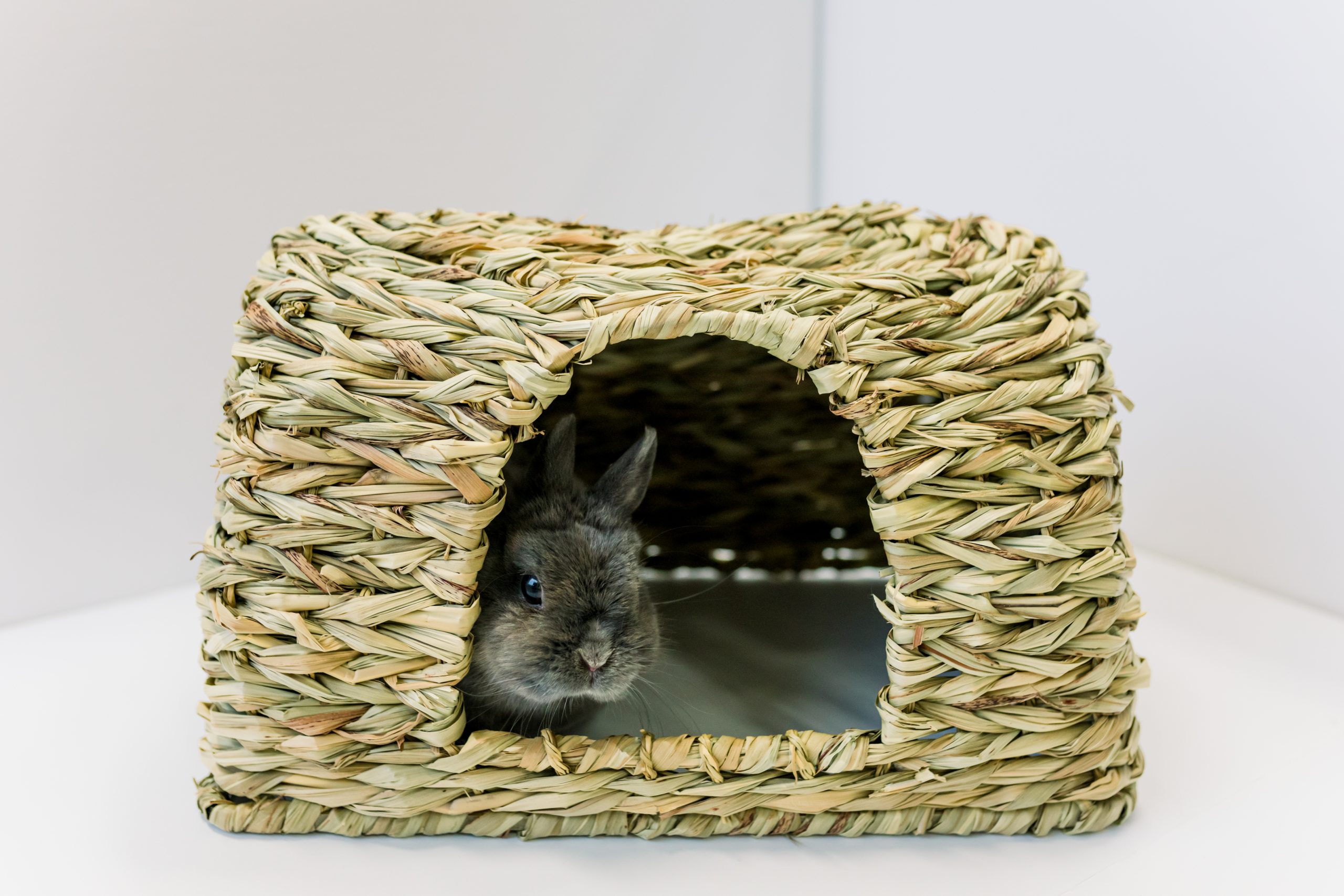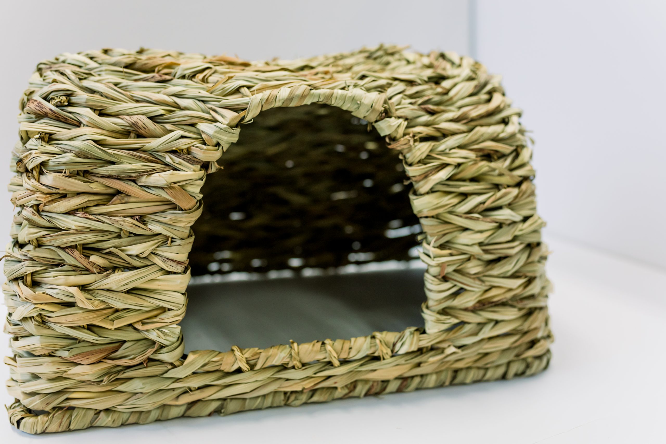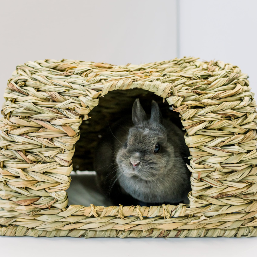 Maison en foin (cachette et cabane) de bonne taille afin qu’un lapin adulte puisse y entrer.
