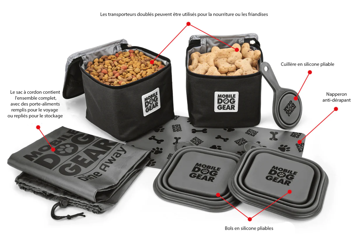 Le Dog Gear Dine-Away Set est conçu pour planifier, emballer, transporter et servir le repas de votre animal. Plus besoin de sacs en plastique, cet ingénieux planificateur de repas est parfait pour les parents de chiens soucieux de l’environnement.