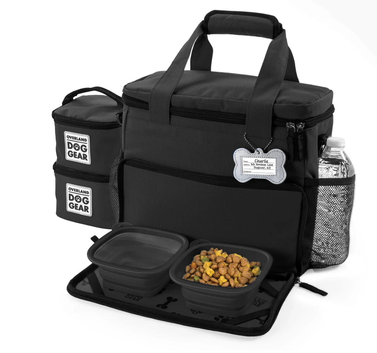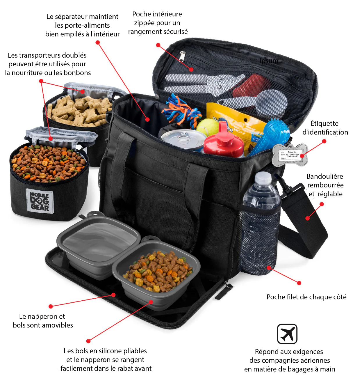 - Grand compartiment principal pour tous les accessoires de votre chien avec des séparateurs pour les contenants à nourriture
