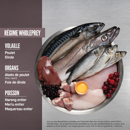 - Notre régime WholePrey authentique contient les parties les plus succulentes de la proie comme la volaille ou le poisson, les organes, les arêtes et les os, à l’image de ce que les ancêtres de votre chien auraient mangé dans la nature.