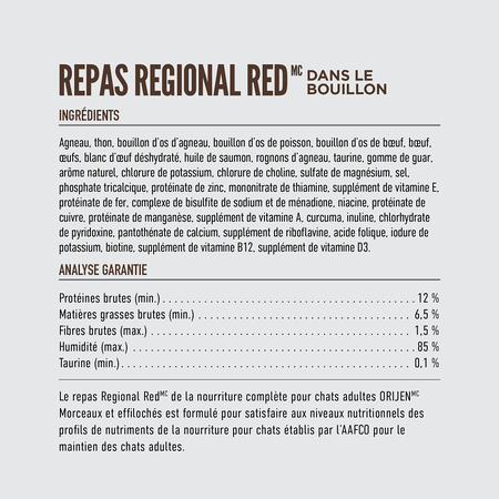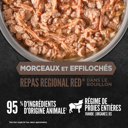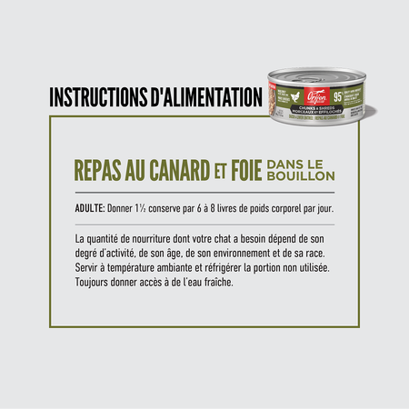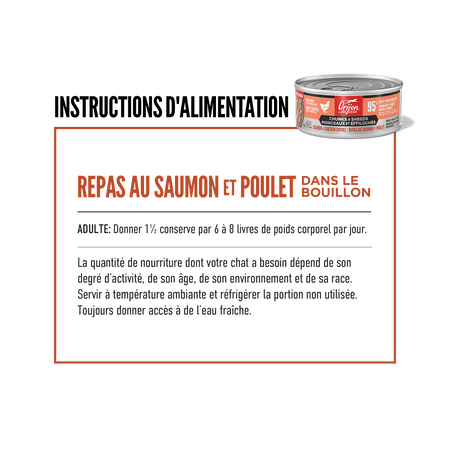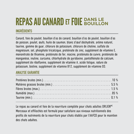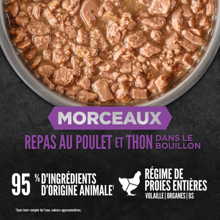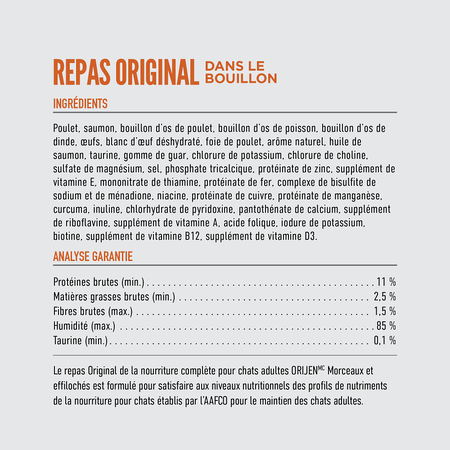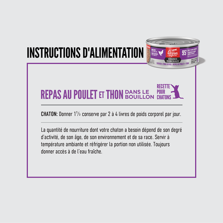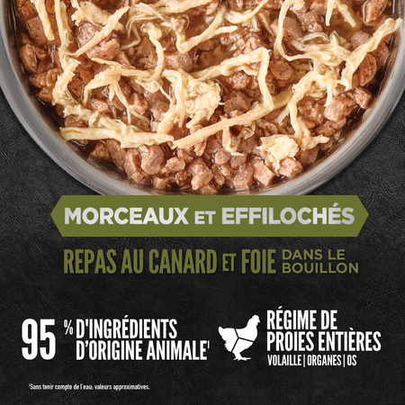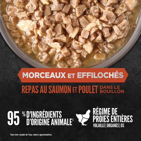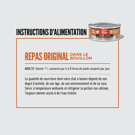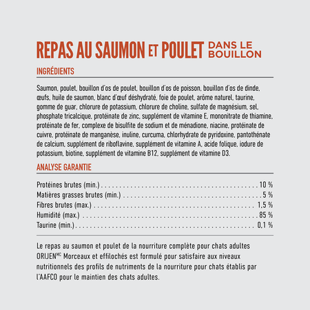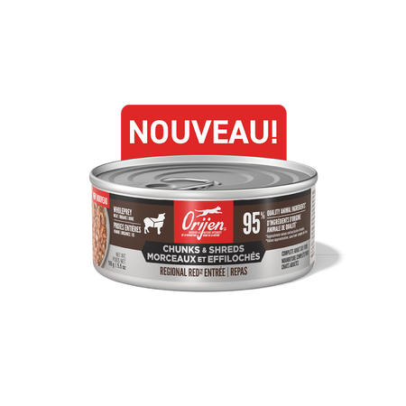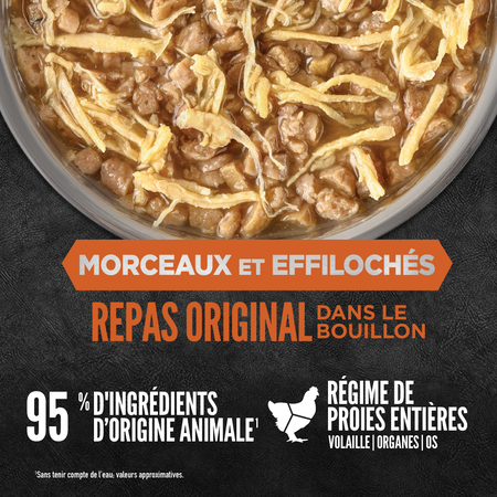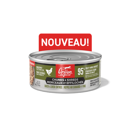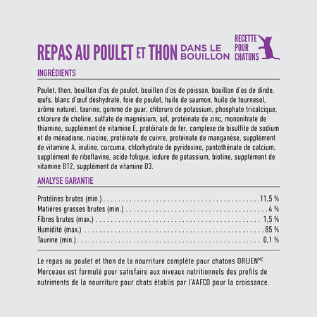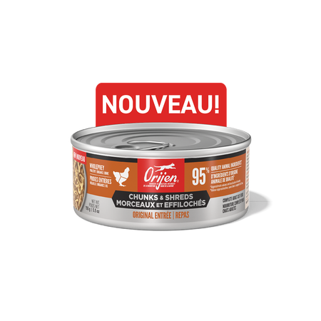 Servez à votre chaton une alimentation complète grâce aux copieux ingrédients de proies entières et à la viande, à la volaille ou au poisson effiloché que contient la nourriture humide pour chats ORIJENMC Morceaux et effilochés! Les chats sont des carnivores obligatoires, ce qui fait qu’ils s’épanouissent au mieux avec une alimentation riche en ingrédients d’origine animale. C’est pourquoi nos recettes contiennent 95 % d’ingrédients d’origine animale1, afin de fournir à votre chat l’alimentation biologiquement appropriée qui lui est due. Cette recette contient également de succulents ingrédients de proies entières, comme du foie de poulet, pour fournir à votre chat des nutriments riches et variés. Le bouillon d’os contribue à l’hydratation de votre chat tout en apportant à sa nourriture une saveur alléchante. Servez à votre chat la texture et à la variété des ingrédients d’origine animale crus que contient chaque conserve de nourriture ORIJENMC Morceaux et effilochés.