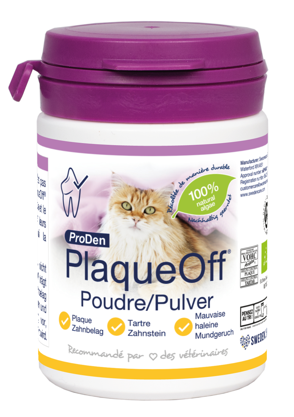 Recette spécifique pour plaire aux chats qui ont tendance à être plus difficiles, la poudre dentaire PlaqueOff élimine la mauvaise haleine, le tartre et la plaque dentaire.