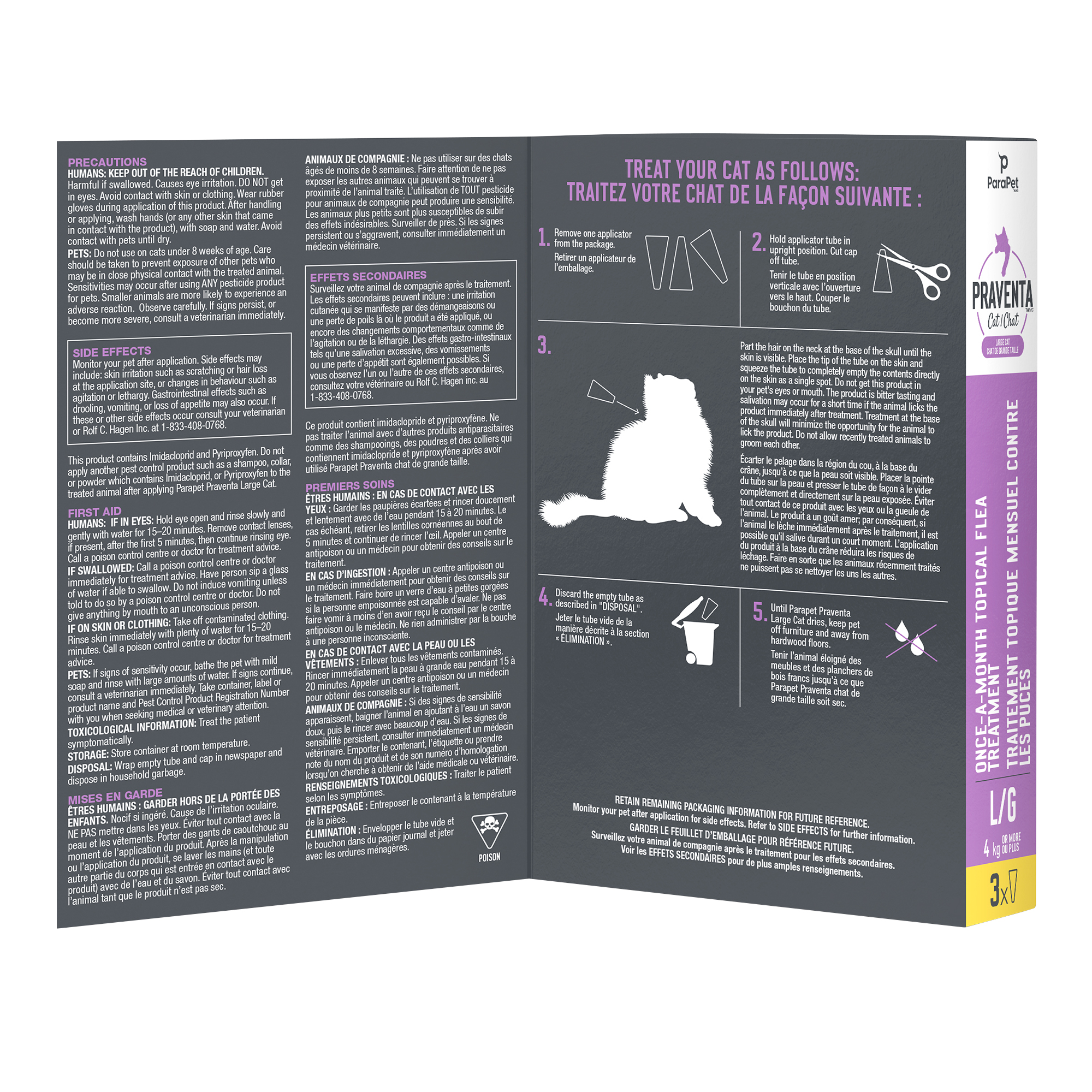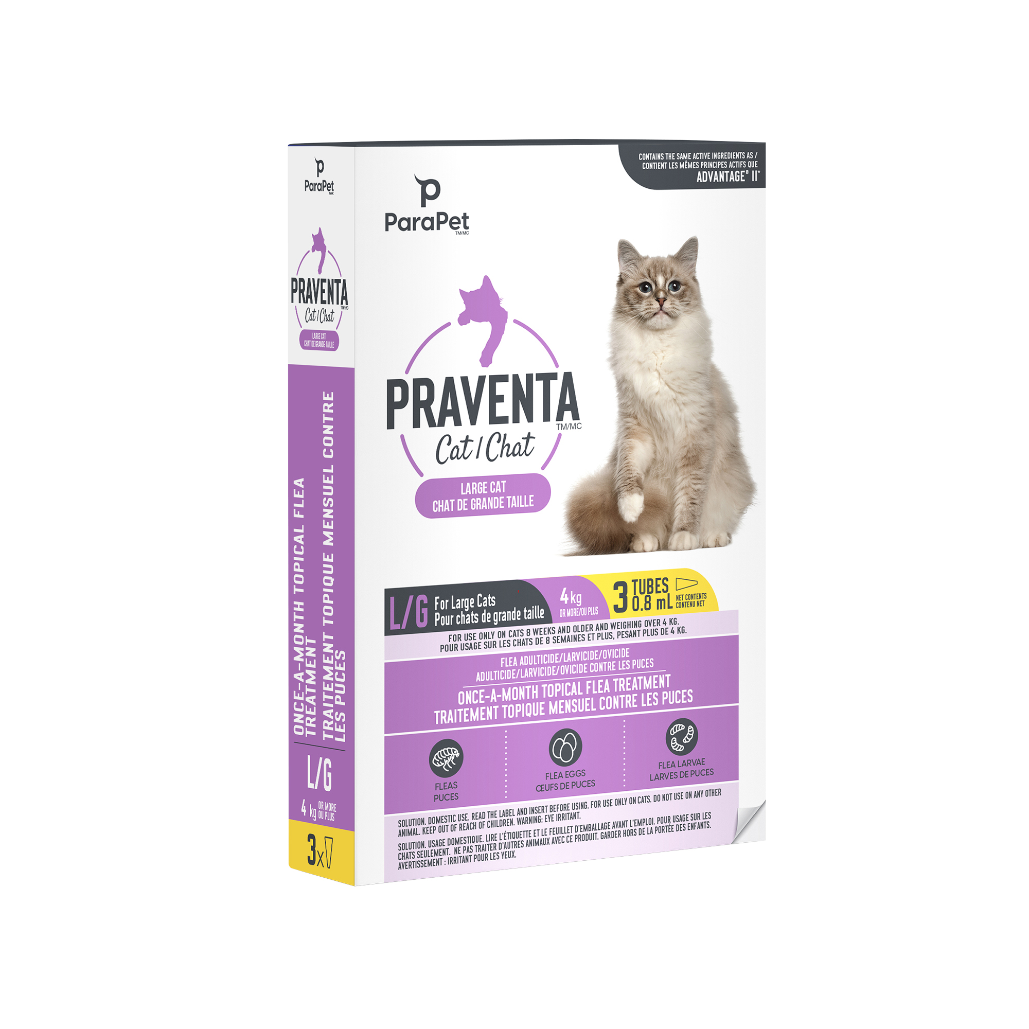 Voici le produit Praventa pour chats de Parapet, un traitement topique mensuel à large spectre de qualité vétérinaire contre les puces. Ce traitement comprend tous les bienfaits de la marque vétérinaire principale, mais offre aux détaillants une option à prix abordable. Contenant de l’imidaclopride et du pyriproxyfène, le traitement Praventa pour chats élimine et repousse les puces, les oeufs et les larves de puces au contact.