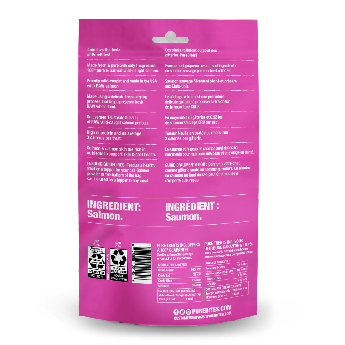 Chez PureBites, voici ce que nous disons toujours aux parents d’animaux de compagnie : « Allez-y, regardez nos ingrédients ». Les gâteries séchées à froid de saumon CRU PureBites pour chat sont le summum en matière de gâterie ou garniture à haute valeur ajoutée et à ingrédients limités. Elles sont composées de seulement 1 ingrédient simple de qualité alimentaire humaine que vous pouvez lire, prononcer et en lequel vous pouvez avoir confiance : du saumon sockeye sauvage pur à 100 %. Rien d’autre. Pas de colorant artificiel, d’agent de remplissage ou d’édulcorant. Notre saumon est fièrement pêché et préparé aux États-Unis en utilisant un processus délicat de séchage à froid à basse température qui aide à conserver les aliments entiers CRUS, en préservant ce goût dont les chats raffolent et une nutrition supérieure riche en protéines et faible en calories que leurs parents adorent. Les gâteries séchées à froid sont un excellent complément à un régime CRU car elles offrent plusieurs des avantages de la nourriture CRUE sans les inconvénients de la réfrigération.