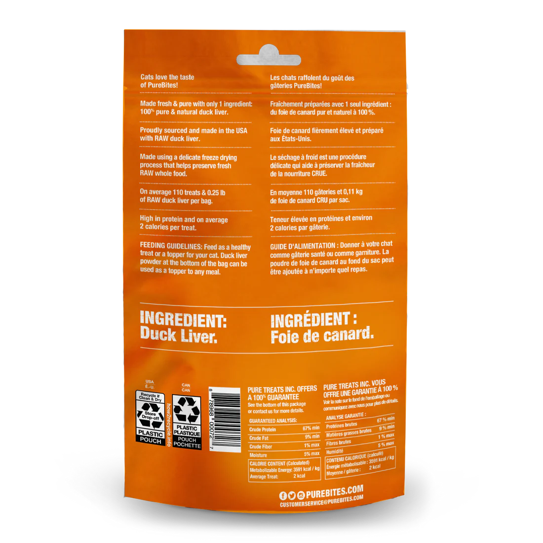 Chez PureBites, voici ce que nous disons toujours aux parents d’animaux de compagnie : « Allez-y, regardez nos ingrédients ». Les gâteries séchées à froid au foie de canard CRU PureBites pour chat sont le summum en matière de gâterie ou garniture à haute valeur ajoutée et à ingrédients limités. Elles sont composées de seulement 1 ingrédient simple de qualité alimentaire humaine que vous pouvez lire, prononcer et en lequel vous pouvez avoir confiance : du foie de canard pur à 100 %. Rien d’autre. Pas de colorant artificiel, d’agent de remplissage ou d’édulcorant. Notre foie de canard est fièrement élevé et préparé aux États-Unis en utilisant un processus délicat de séchage à froid à basse température qui aide à conserver les aliments entiers CRUS, en préservant ce goût dont les chats raffolent et une nutrition supérieure riche en protéines et faible en calories que leurs parents adorent. Les gâteries séchées à froid sont un excellent complément à un régime CRU car elles offrent plusieurs des avantages de la nourriture CRUE sans les inconvénients de la réfrigération.
