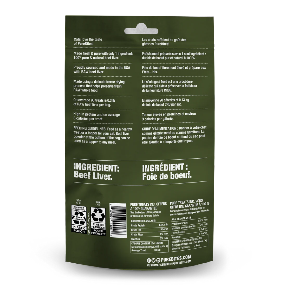 Chez PureBites, voici ce que nous disons toujours aux parents d’animaux de compagnie : « Allez-y, regardez nos ingrédients ». Nos gâteries au foie de bœuf CRU séché à froid PureBites sont le summum en matière de gâterie ou garniture à haute valeur ajoutée et à ingrédients limités. Elles sont composées de seulement 1 ingrédient simple de qualité alimentaire humaine que vous pouvez lire, prononcer et en lequel vous pouvez avoir confiance : 100 % de foie de bœuf américain pur. Rien d’autre. Pas de colorants, agents de remplissage ou édulcorants artificiels. Notre foie de bœuf est fièrement élevé et préparé aux États-Unis en utilisant un processus délicat de séchage à froid à basse température qui aide à conserver les aliments entiers CRUS, en préservant ce goût dont les chats raffolent et une nutrition supérieure riche en protéines et faible en calories que leurs parents adorent. Les gâteries séchées à froid sont un excellent complément à un régime CRU car elles offrent plusieurs des avantages de la nourriture CRUE sans les inconvénients de la réfrigération.