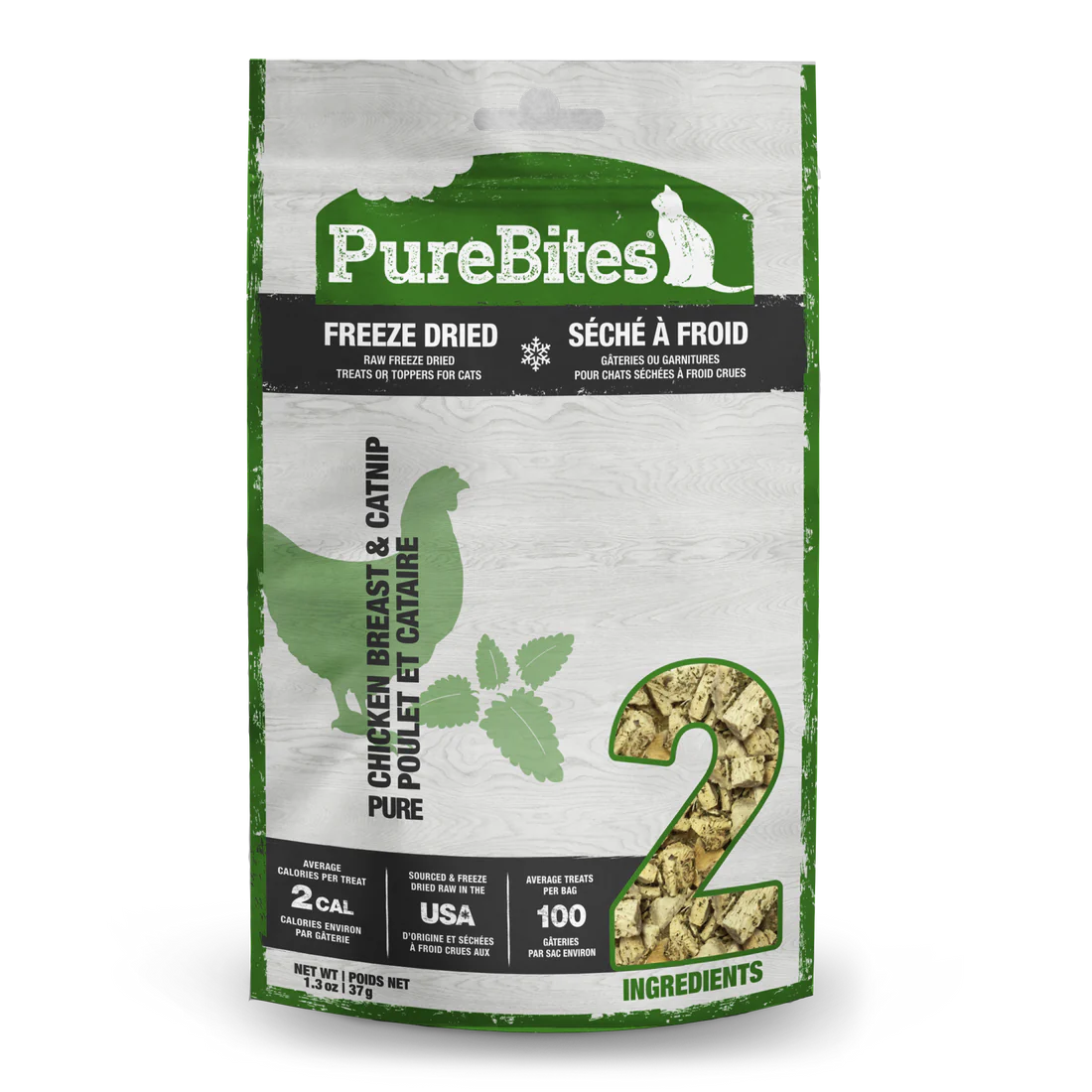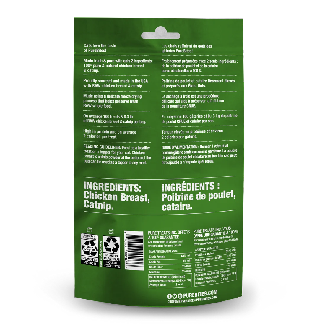 Chez PureBites, voici ce que nous disons toujours aux parents d’animaux de compagnie « Allez-y, regardez nos ingrédients ». Nos gâteries de poitrine de poulet et cataire CRU séché à froid PureBites sont le summum en matière de gâterie ou garniture à haute valeur ajoutée et à ingrédients limités. Elles sont composées de seulement 2 ingrédients simple de qualité alimentaire humaine que vous pouvez lire, prononcer et en lequel vous pouvez avoir confiance : de la poitrine de poulet et cataire pure à 100 %. Rien d’autre. Pas de colorant artificiel, d’agent de remplissage ou d’édulcorant. Notre poulet est fièrement élevé et préparé aux États-Unis en utilisant un processus délicat de séchage à froid à basse température qui aide à conserver les aliments entiers CRUS, en préservant ce goût dont les chats raffolent et une nutrition supérieure riche en protéines et faible en calories que leurs parents adorent. Les gâteries séchées à froid sont un excellent complément à un régime CRU car elles offrent plusieurs des avantages de la nourriture CRUE sans les inconvénients de la réfrigération.