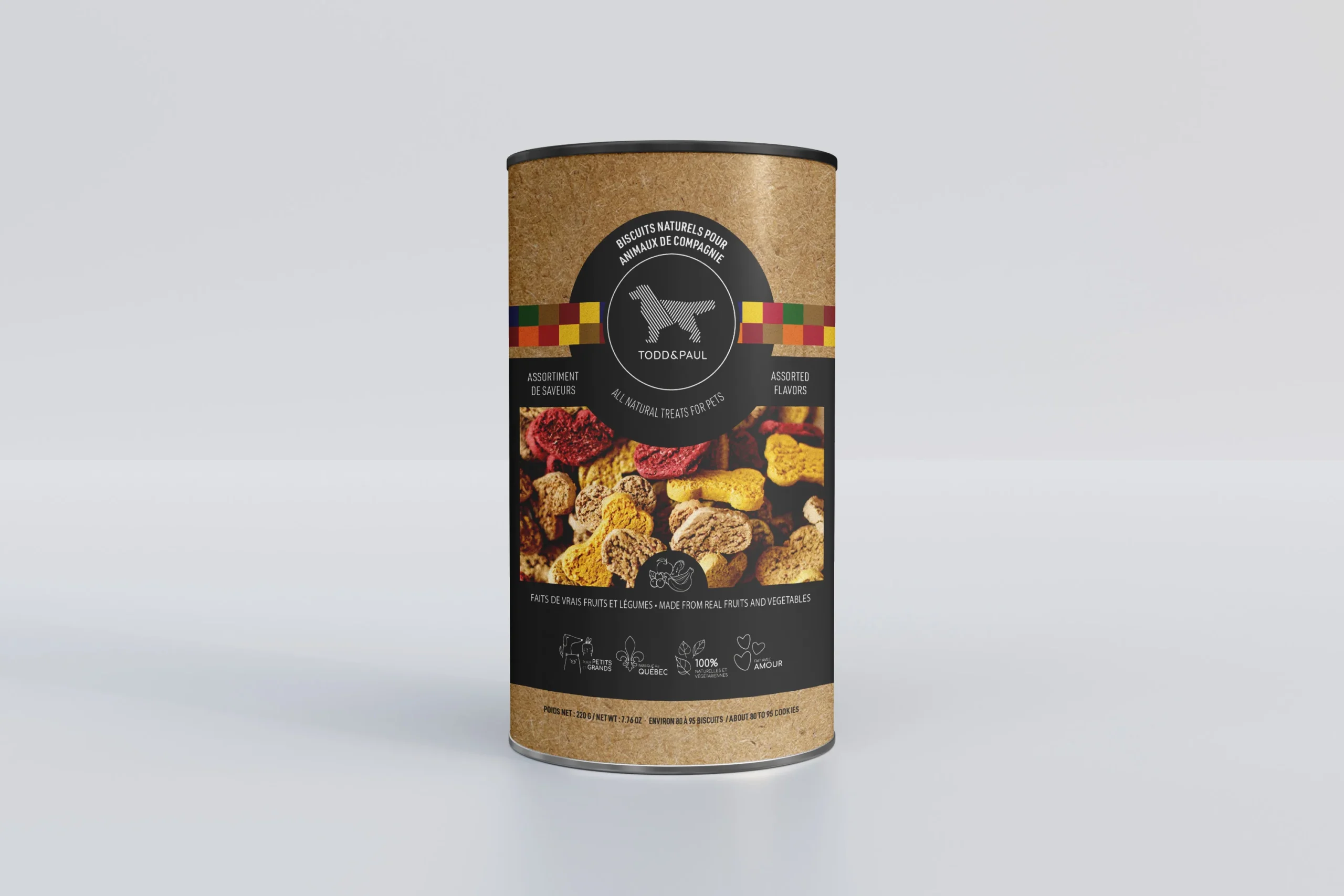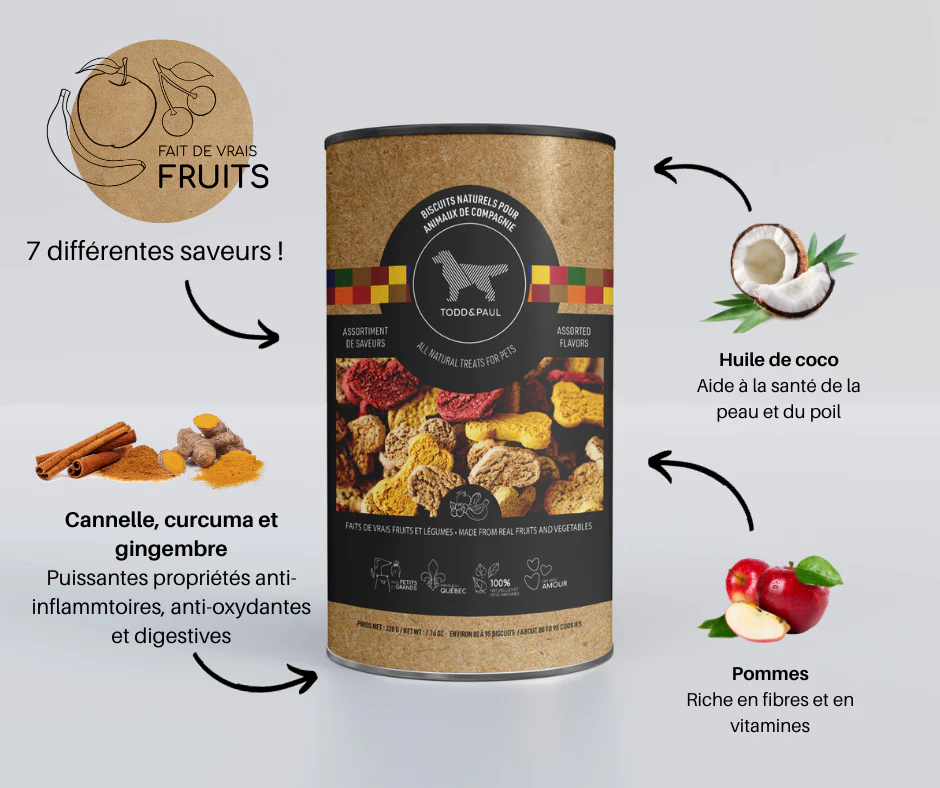La boîte de biscuits assortis est idéale pour découvrir les différentes saveurs de biscuits ou tout simplement pour varier la saveur de la gâterie offerte à votre animal.